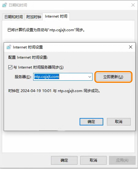 (5)输入时间服务器的IP地址:ntp.cqjxjt.com,点击立即更新,时间就同步成功了,点击确定保存设置。
